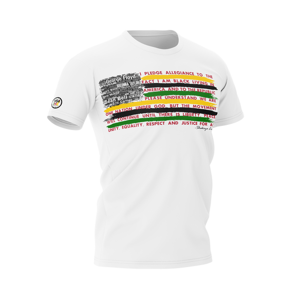 The Black Pledge Story: Written and designed by Shakeya Levell after the National Coverage of George Floyd’s death and shooting of Jacob Blake in 2020, is a Patriotic message with a Juneteenth vide. The Pledge and colored stripes represent the 13 stripes of the American Flag. Where the stars would normally be are some the names of unarmed black men and women killed in our country in law enforcement involved incidents.